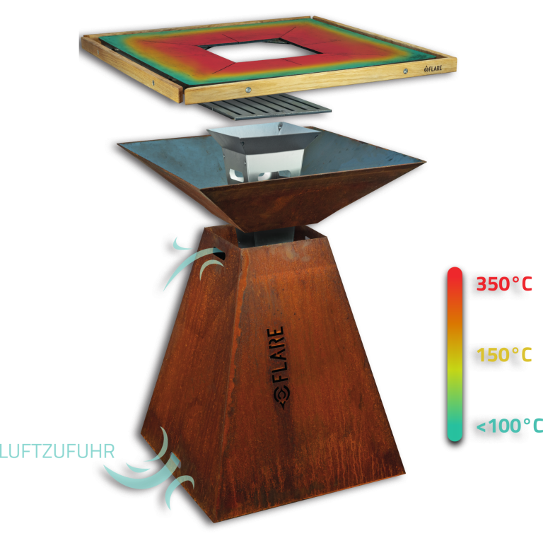 Egal, was du auf dem FLARE zubereiten willst, es gibt genug Platz für alle Gerichte. In der Mitte ein Steak grillen, während am Rand das Gemüse schmort ohne zu verbrennen. Kein Problem durch die verschiedenen Temperaturzonen, die durch die einzigartige quadratische Form der Platte möglich sind. Mit der ausgeklügelten Luftzufuhr musst du dir auch keine keine Sorgen machen, dass dein Feuer schnell erlischt. Auch nicht Grillaufsätzen über der Öffnung!