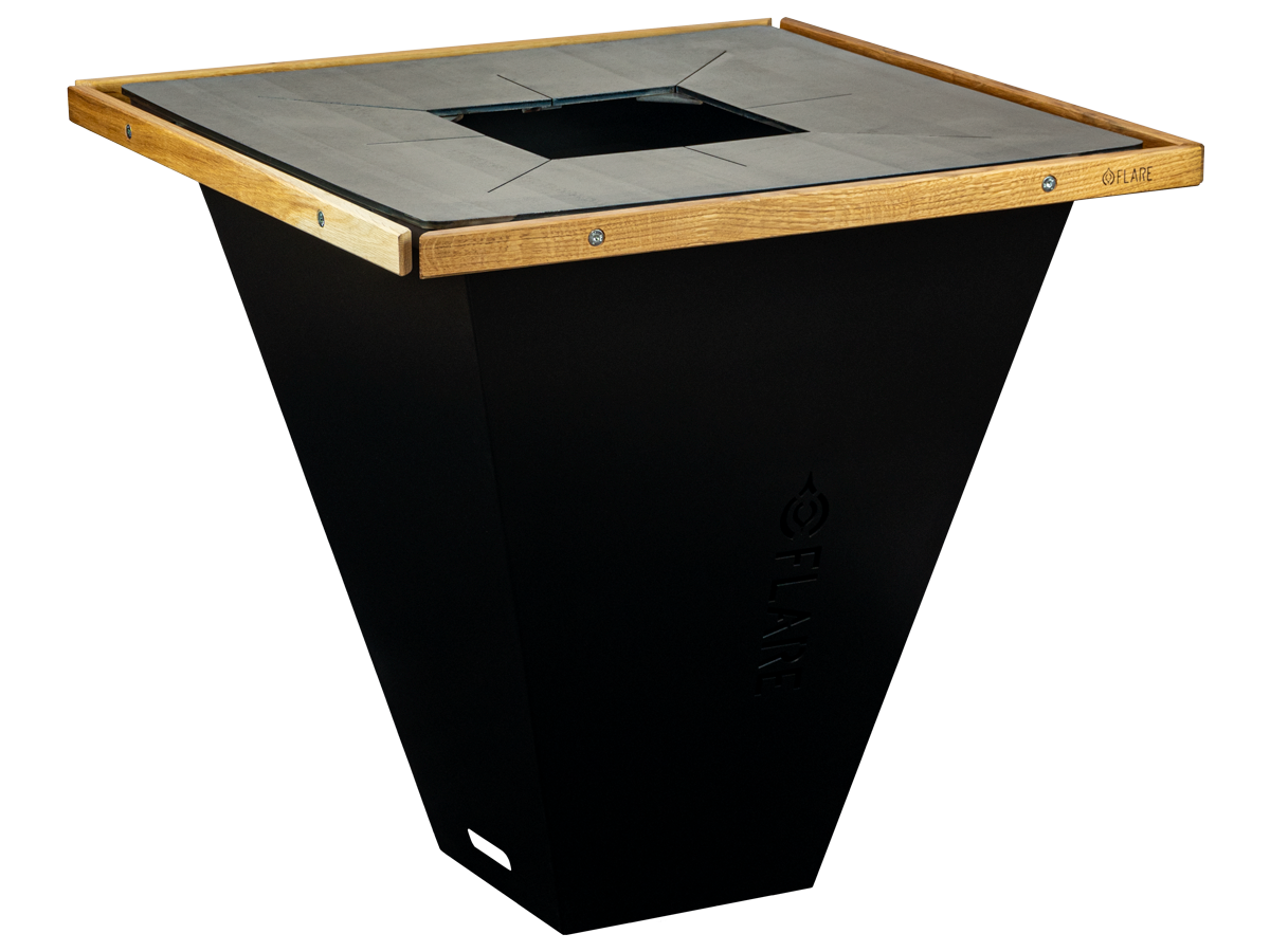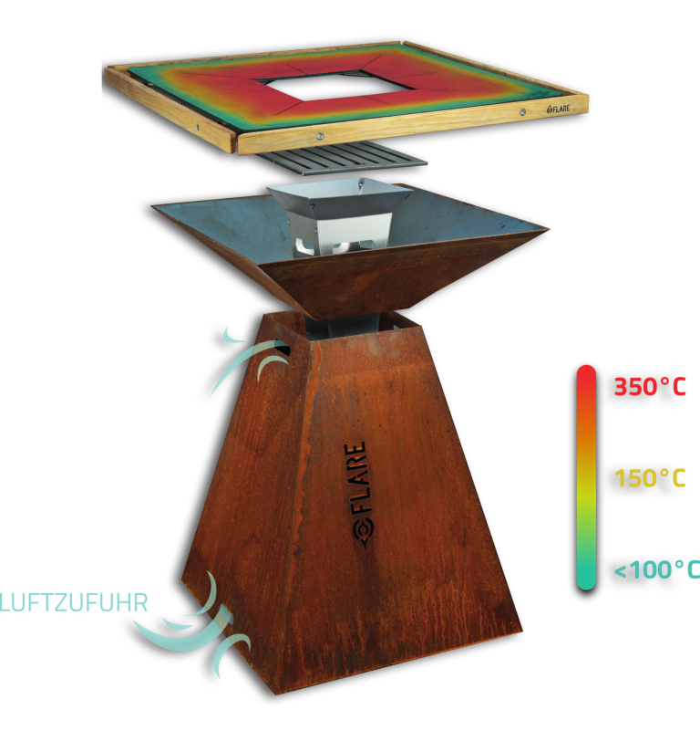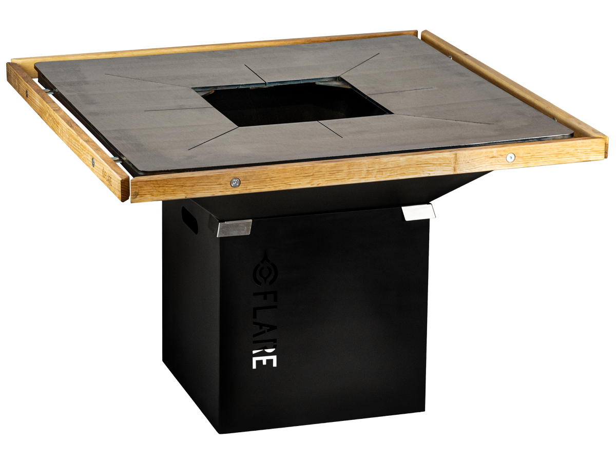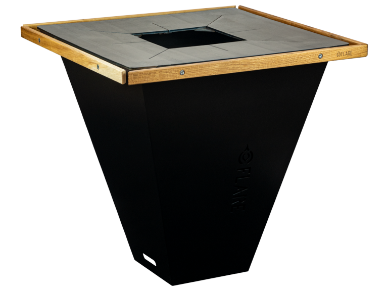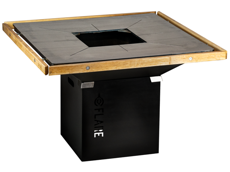 Quadratische Feuerplatte (80×80 cm) aus hochwertigem Stahl für beeindruckendes Grillen. Dank intelligentem modularem Stecksystem vielfältige Varianten möglich. Der Sockel des FLARE Grills „original“ ist umkehrbar, ermöglicht bequeme Arbeitshöhe von 80 cm oder 100 cm. Flexibles und komfortables Grillen. Die schwarze Version besticht mit schwarz lackiertem Sockel und hitzebeständig beschichteter Feuerschale – edler Look und Schutz vor Wind und Wetter kombiniert.